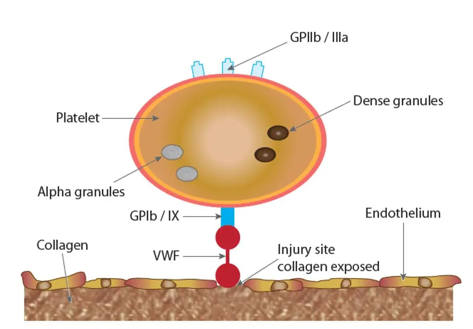 • Adhesion: von Willebrand factor adheres platelets to exposed subendothelial collagen via the platelet receptor glycoprotein Ib (GPIb). Platelets also adhere directly to collagen by other receptors.
